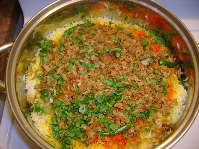 In a large pot, layer 1/3 of the rice. Layer 1/2 of the chicken mixutre. Top with another 1/3 of the rice. Layer the remaining chicken mixture followed by the rest of the rice. Sprinkle food colour, lemon juice, coriander, green chillies and fried onions on top. Put a paper towel across the top of the pot and seal with the lid of the pot. Cook for about 1 hour on low heat. Check after 1/2 hour to see if the rice is done.
