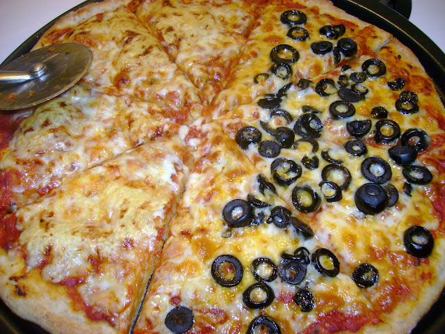 When I made this my dough didn’t double in size and I was getting all upset with myself knowing I screwed up somewhere.  But I continued on and made the pizza.  I was so surprised how good it turned out!  I put olives on half the pizza because my son loves olives…I don’t.  He cannot understand why I don’t like olives.