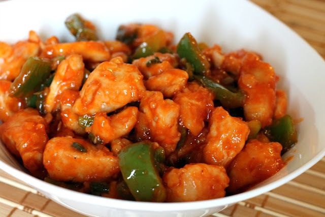 Dust the chicken with 1/3 cup cornstarch and mix. In a non-stick pan, add a little bit of oil and shallow fry the chicken till down. Place on a paper towel lined plate and set aside.