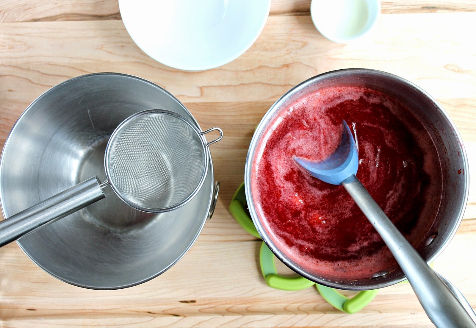 Push the fruit down with a spoon and discard the skins.  My strainer is very small so this took me some time to do.  Chill this in the refrigerator.